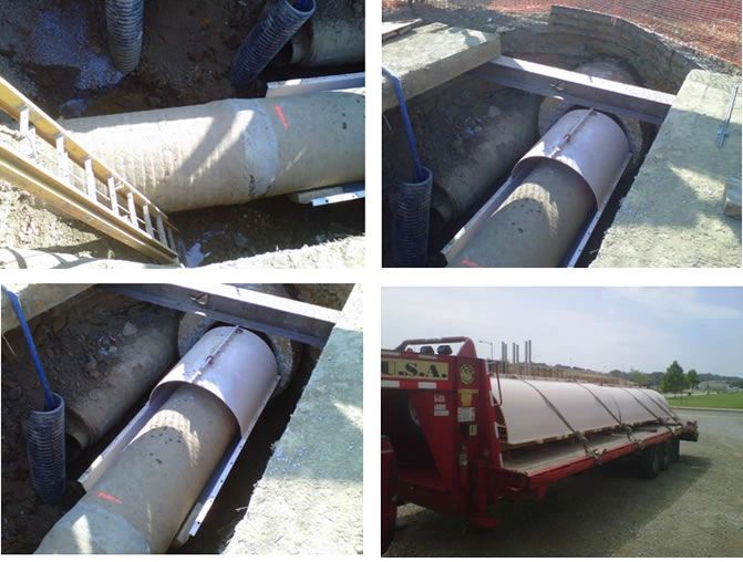 This contractor recently sourced Flanged Maintenance Pipe for split steel casing which was required by Stafford County to provide mechanical protection for an existing PVC sewer pipe. This pipe was installed under planned road construction to connect a nursing home with a medical arts building in Fredericksburg. The company's owner said that he usually would buy steel pipe and couplers, saw them into halves and weld fastening tabs onto each. He then became aware of Ironhed's FMP product and was sold on its potential to save his crew time and his company money. First, the FMP product was dropped at the job site - ready for install (saving him the time and expense to unload bulk pipe at his shop, cut and fabricate the pipe and couplers, and then re-load and transport it to the job site). Secondly, Ironhed welded lifting eyes onto the corners of the FMP making its hoisting, placement, and adjustment as efficient and safe as possible. Lastly, FMP bolted together quickly with a wrench and cordless drill requiring no couplers for the straight run. The workers were concerned that the holes would line up correctly (no doubt a problem with cut & welded steel) and seemed impressed when FMP’s did every time - due to the fact that FMP is an engineered system, manufactured to close tolerances - specifically for this purpose. . . . Back To Index