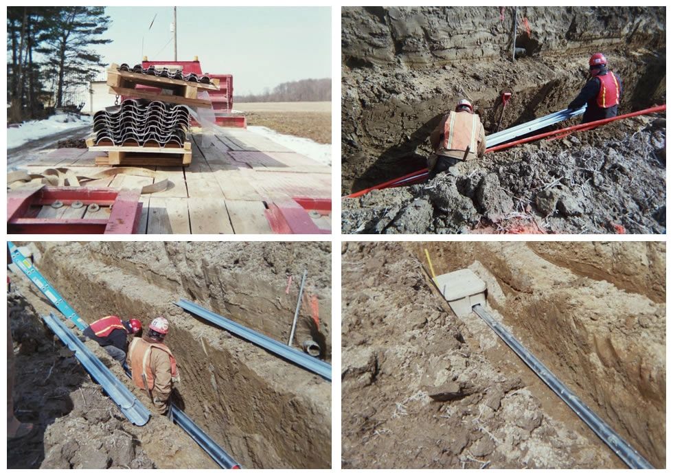 Unlike the hinged split steel, the workers would only have to handle half the amount of weight during the installation process. Due to the fact it was a straight stretch they would be able to start with a 10 foot piece on the bottom and a 5 foot piece on top and stagger the joints the entire length. This would eliminate the need for any couplings and the assembled casing would be extremely strong. Another nice feature was that the inside diameter of the assembled pipe precisely matches the outside diameter of IPS sized conduit. With the extra space, they were able to fit all ten 1¼ innerducts into the casing.